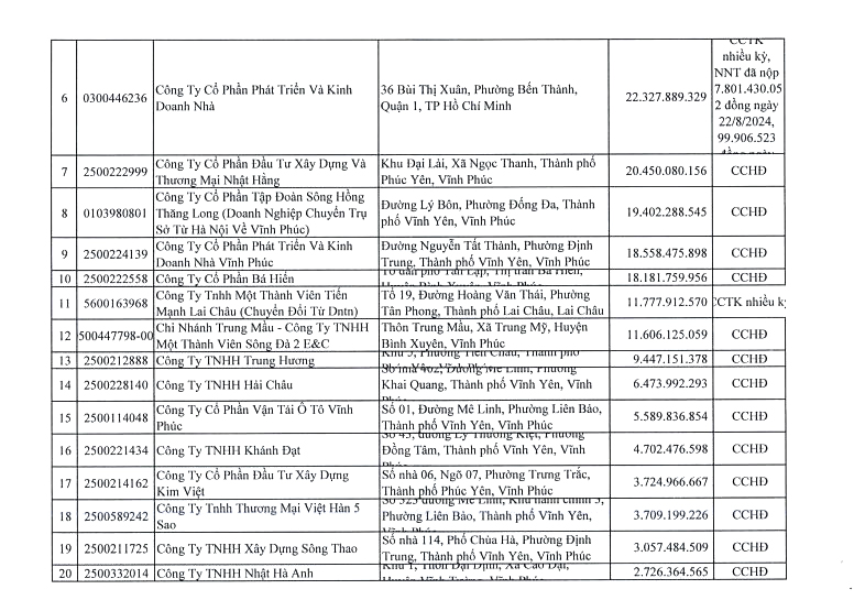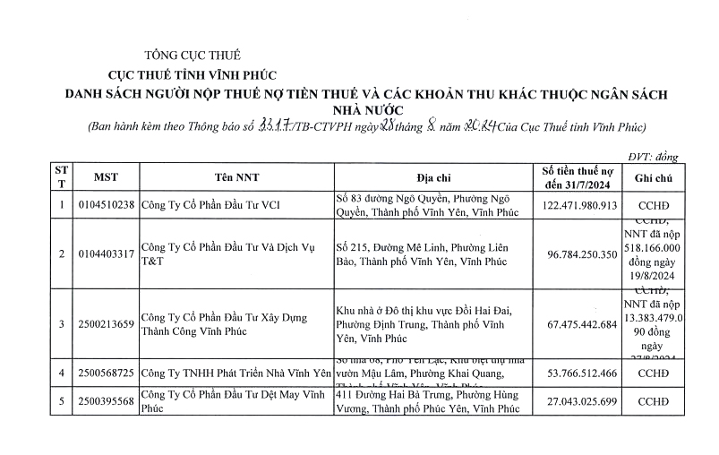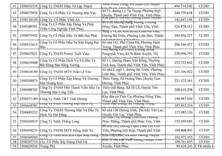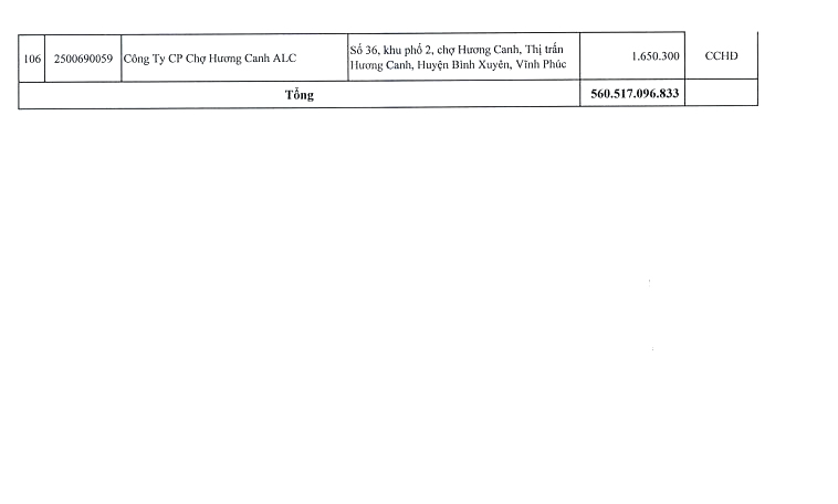 Căn cứ Điều 100 Luật Quản lý thuế số 38/2019 của Quốc hội; Điều 29 Nghị định số 126/2020 của Chính phủ quy định chi tiết một số điều của Luật Quản lý thuế, Cục Thuế tỉnh thực hiện công khai thông tin 106 người nộp thuế còn nợ tiền thuế và các khoản thu khác thuộc ngân sách Nhà nước tính đến thời điểm 31/7/2024 với số tiền là 560.517.096.833 đồng (Bằng chữ: Năm trăm sáu mươi tỷ, năm trăm mười bảy triệu, không trăm chín mươi sáu nghìn, tám trăm ba mươi ba đồng).