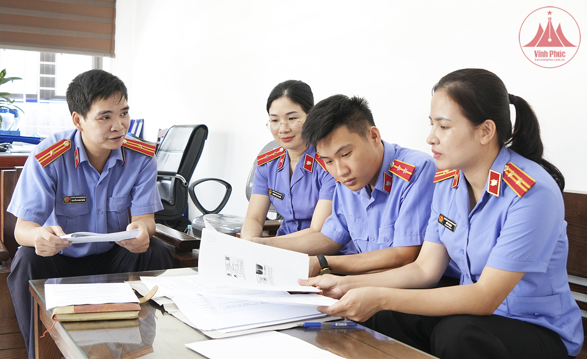 Lãnh đạo, cán bộ Viện Kiểm sát nhân dân huyện Bình Xuyên trao đổi nghiệp vụ, nâng cao hiệu quả công tác tiếp dân, giải quyết khiếu nại tố cáo. Ảnh: Dương Hà